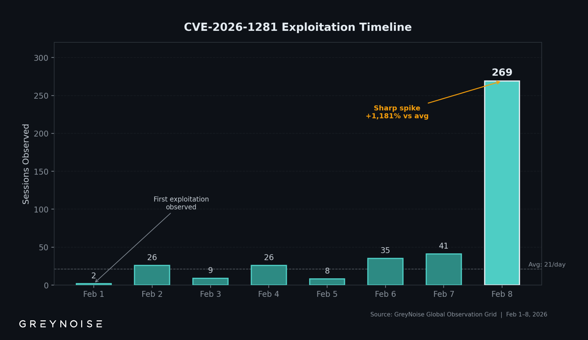 GreyNoise first detected CVE-2026-1281 exploitation attempts on February 1, three days after disclosure. Between February 1 and February 9, GreyNoise sensors recorded 417 exploitation sessions from 8 unique source IPs.