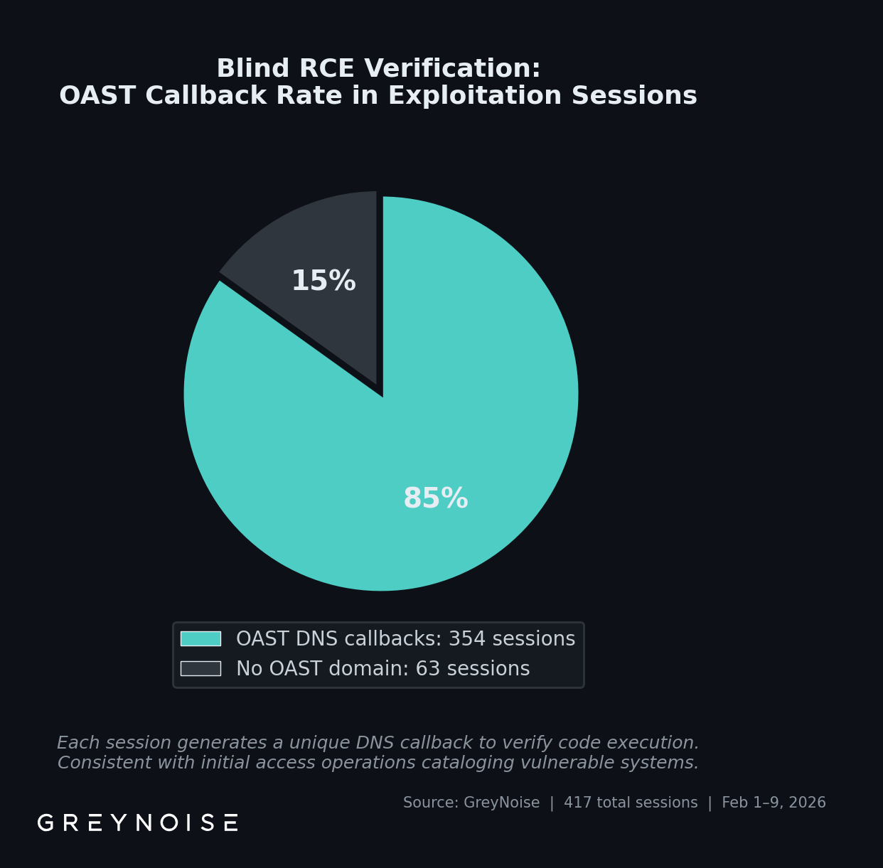 Of 417 exploitation sessions, 354 (85%) triggered GreyNoise’s out-of-band application security testing (OAST) interaction domain detection. The payloads instruct the target to generate a DNS callback to a unique subdomain, a technique that confirms command execution without requiring a direct response back to the attacker.