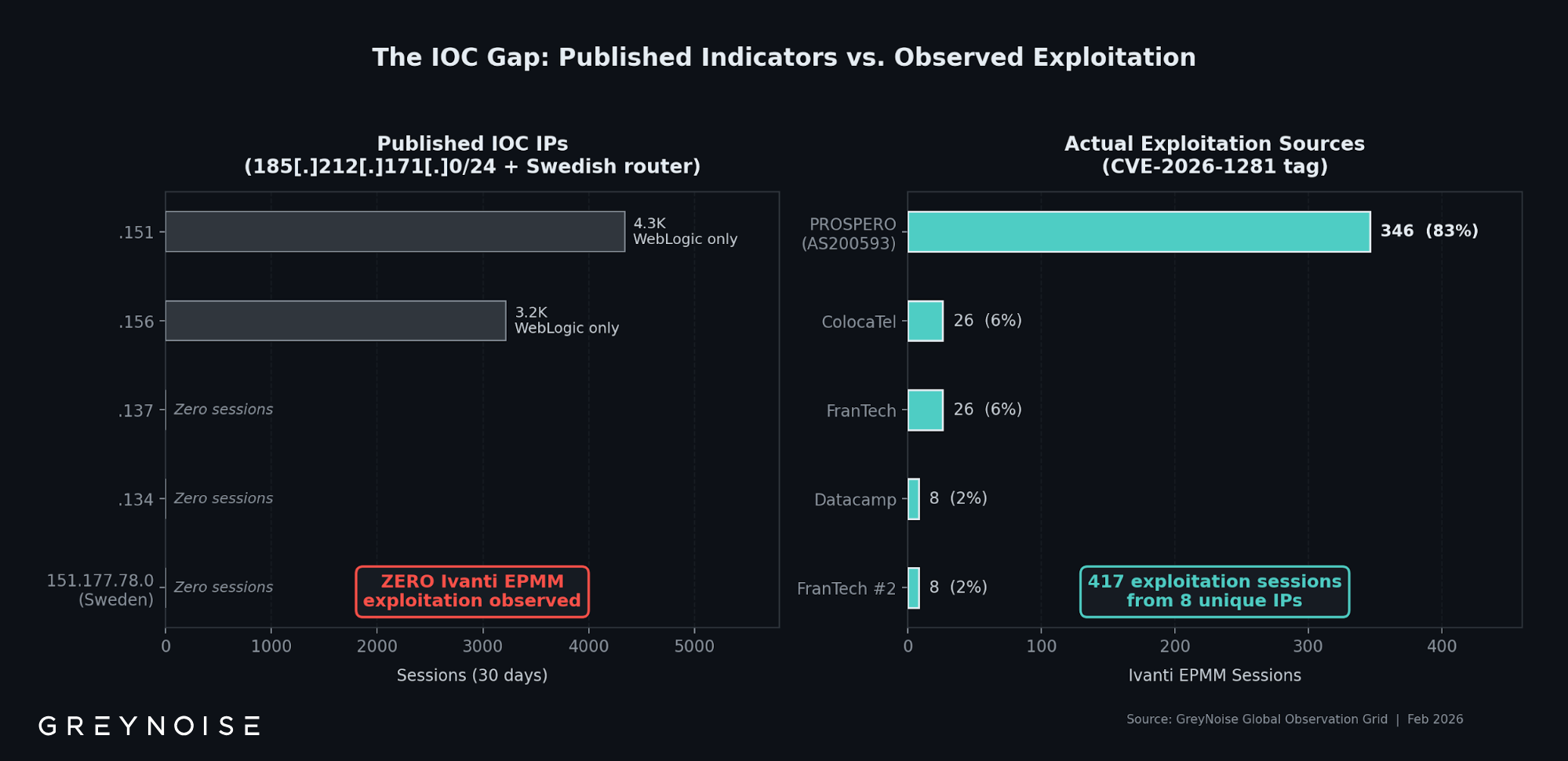 The GreyNoise Global Observation Grid observed active exploitation of two critical Ivanti Endpoint Manager Mobile vulnerabilities, and 83% of that exploitation traces to a single IP address on bulletproof hosting infrastructure that does not appear on widely circulated IOC lists. Meanwhile, several of the most-shared IOCs for this campaign show zero Ivanti exploitation in GreyNoise data. They are scanning for Oracle WebLogic instead. Defenders blocking only the published indicators may be watching the wrong door.