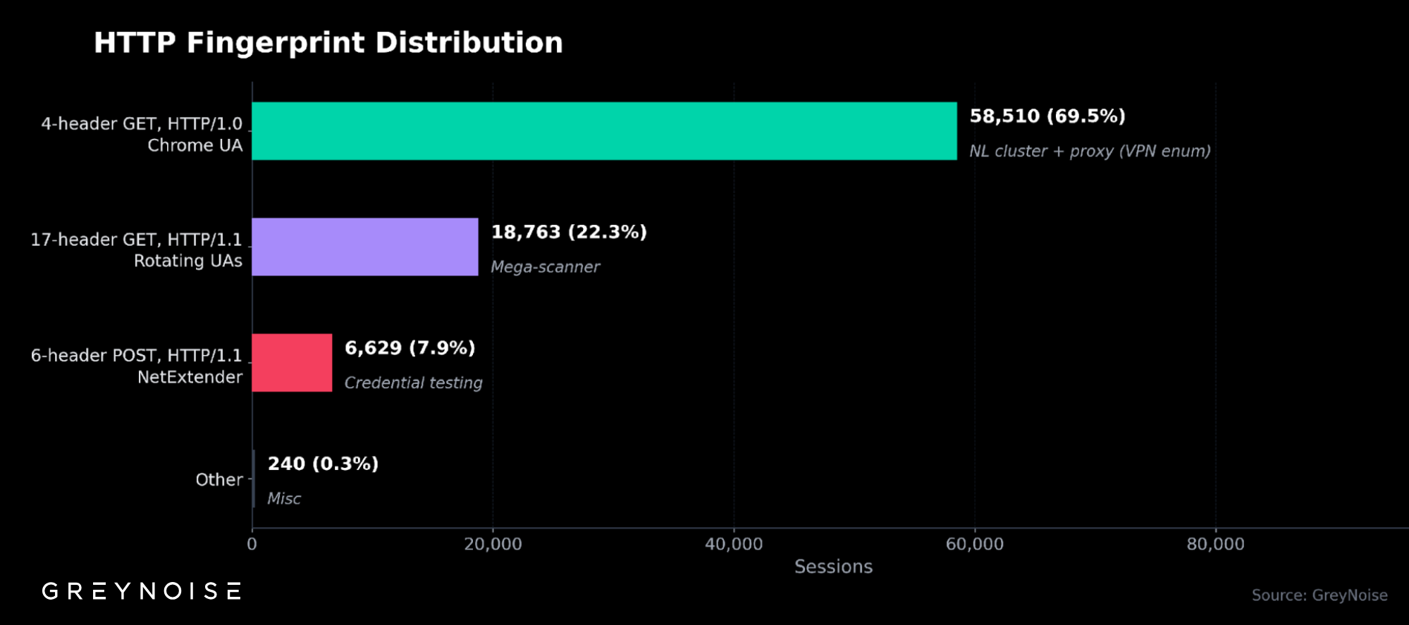 This is not the first time GreyNoise has observed this pattern. In December 2025, GreyNoise documented a coordinated credential campaign targeting both Palo Alto and SonicWall VPN infrastructure across 9 million sessions from more than 7,000 IPs, sharing identical client fingerprints across both vendors. The February 2026 campaign represents a continuation and intensification of VPN-focused reconnaissance.