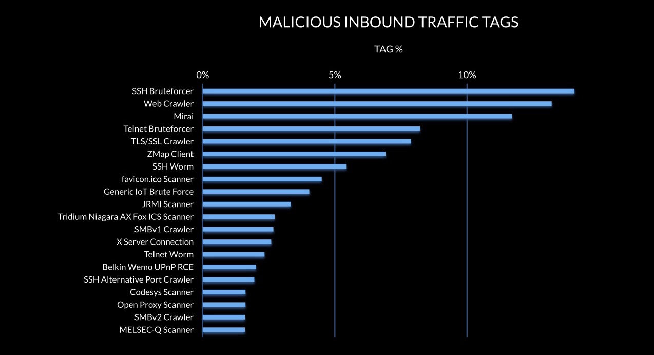 Routers, exposed storage and IoT devices, and compromised laptops/desktops are a large part of why residential and small business ISPs regularly top the list. To understand why, all we need to do is look at the top “tags” (“detections” in intrusion detection and prevention nomenclature) GreyNoise sees in this inbound traffic: